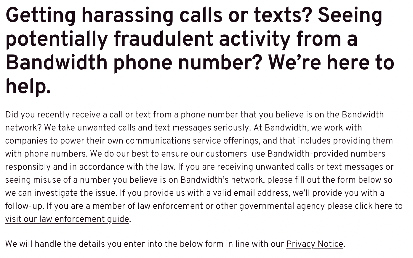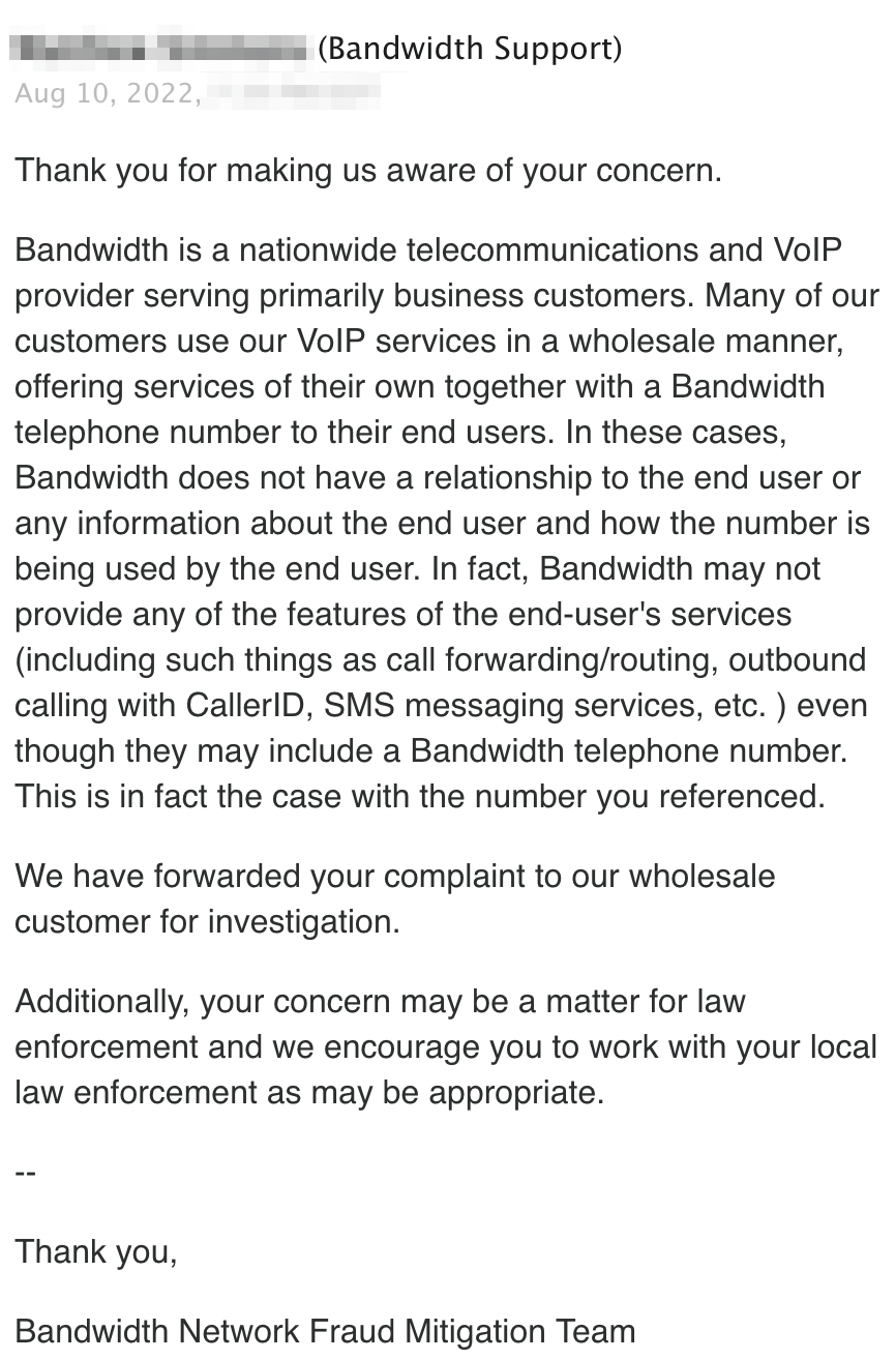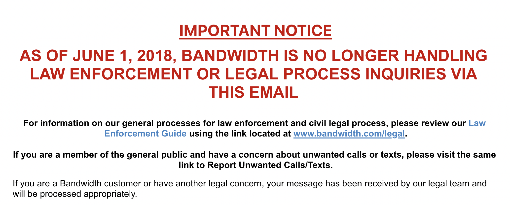 Bandwidth.com will not disclose the sub-carrier or service, thus blocking any attempts at me resolving at the carrier level. Further, they push acceptable use entirely to their undisclosed customer.