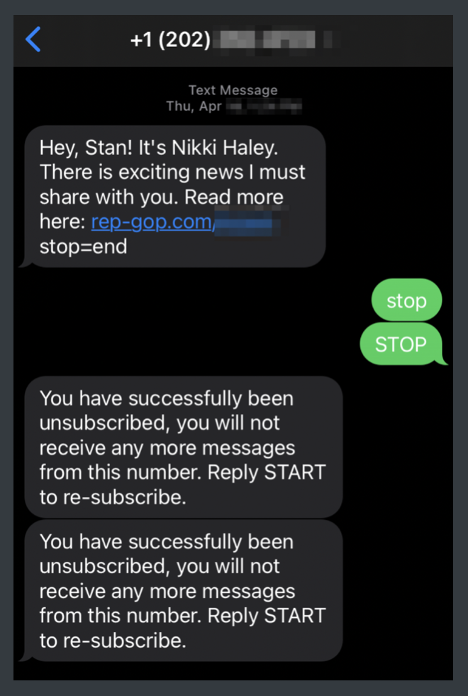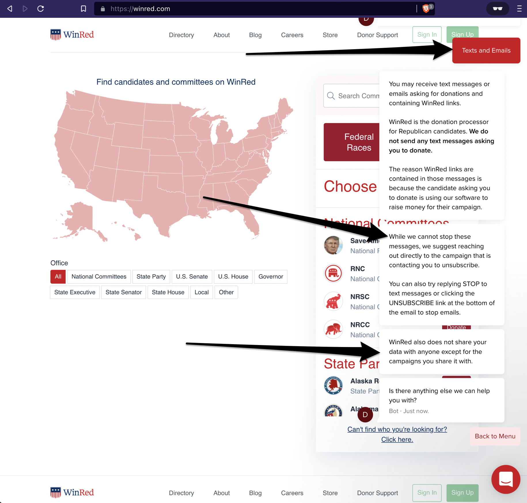 I browsed to the Winred site to opt out of messages. Their site has a chatbot that provides categories of questions, including text messages.